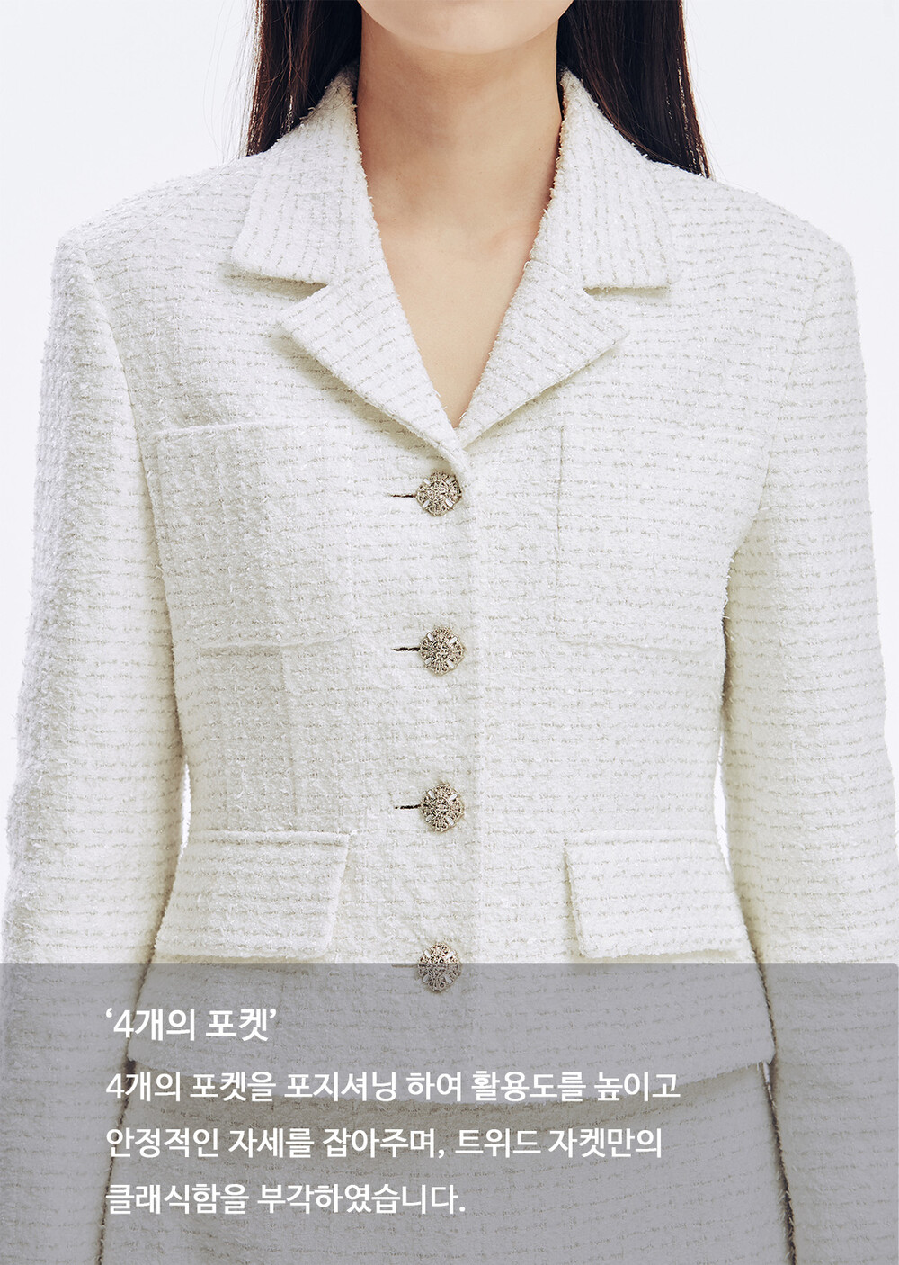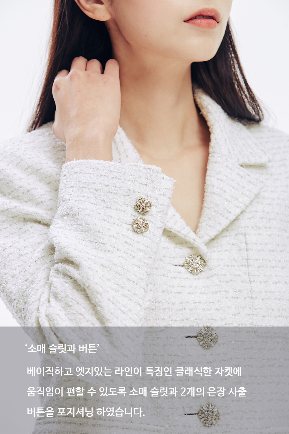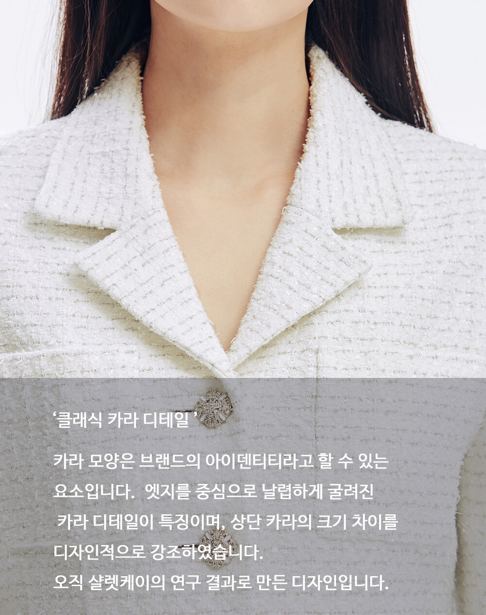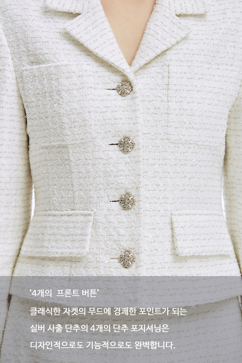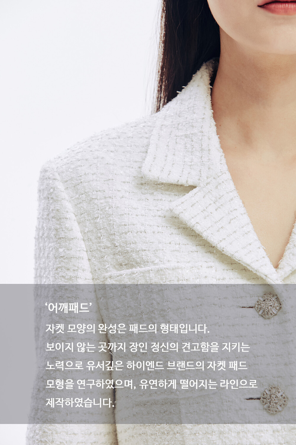 - 원단 : 화이트 원사와 실버 메탈사의 격차 트위드 짜임으로 깨끗하고 맑은 느낌의 '클래식하면서도 매트한 무드'가 특징입니다. 자칫 밋밋할 수 있는 화이트 원단에 은은하게 반짝이는 실버 원사가 경쾌함을 더합니다. 빛에 따라 은은하게 빛나는 예쁜 쿨톤의 원단입니다.