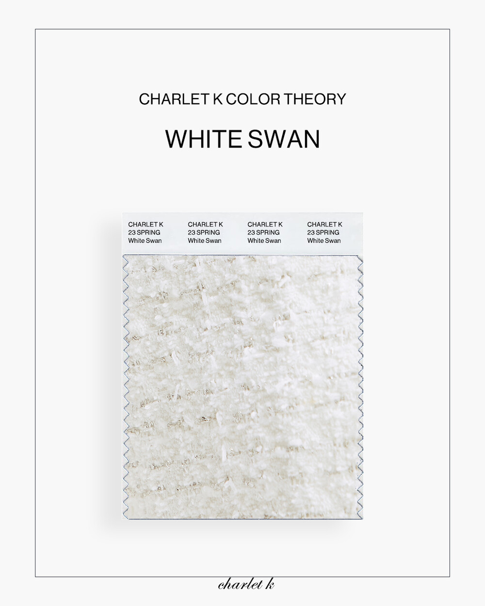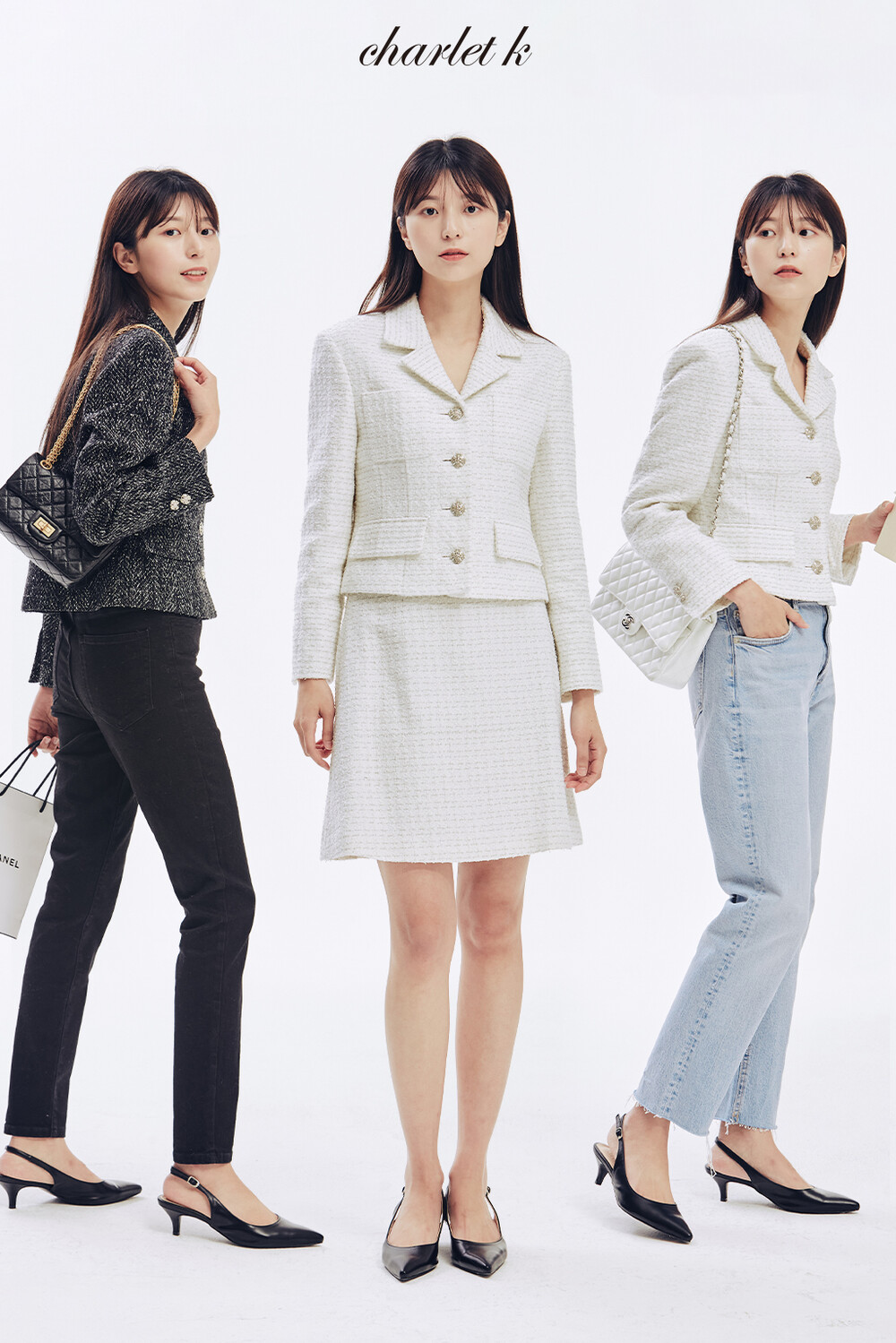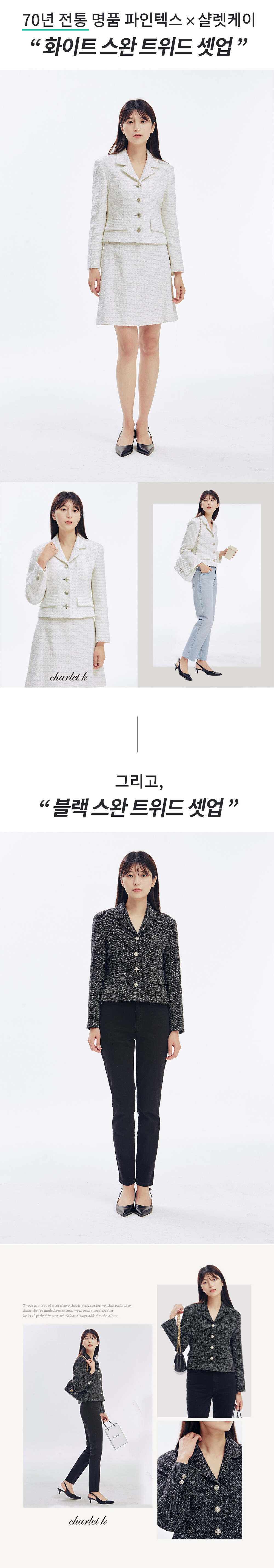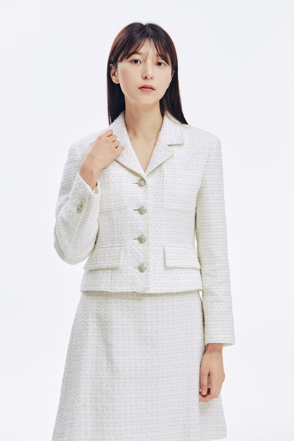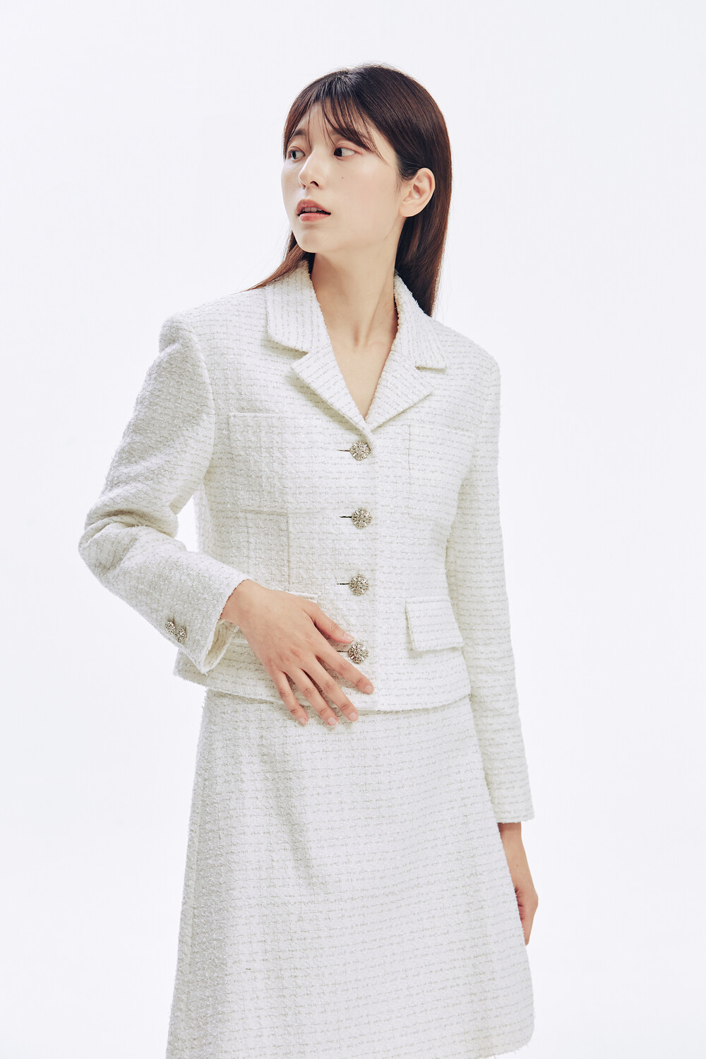 - 원단 : 화이트 원사와 실버 메탈사의 격차 트위드 짜임으로 깨끗하고 맑은 느낌의 '클래식하면서도 매트한 무드'가 특징입니다. 자칫 밋밋할 수 있는 화이트 원단에 은은하게 반짝이는 실버 원사가 경쾌함을 더합니다. 빛에 따라 은은하게 빛나는 예쁜 쿨톤의 원단입니다.
