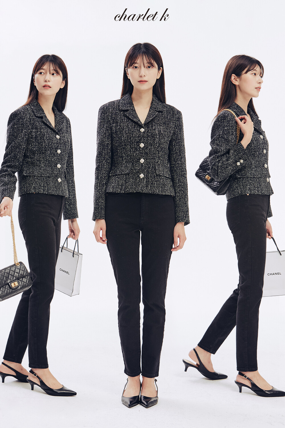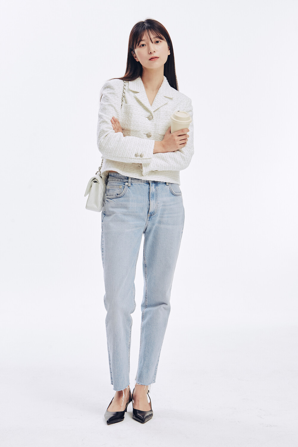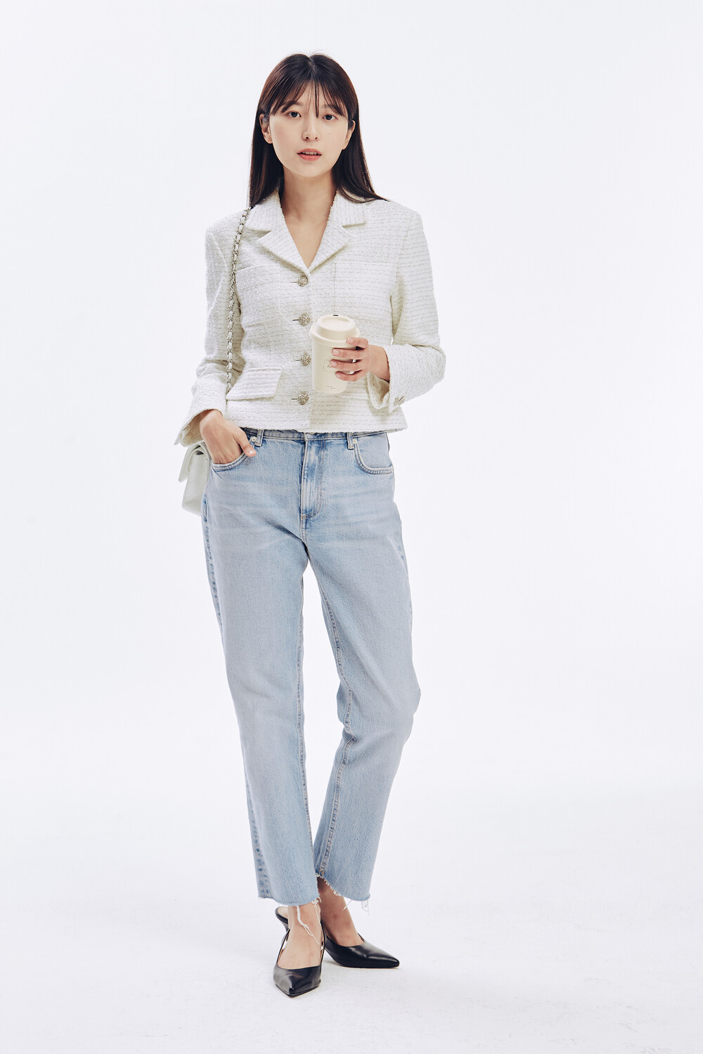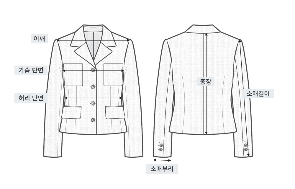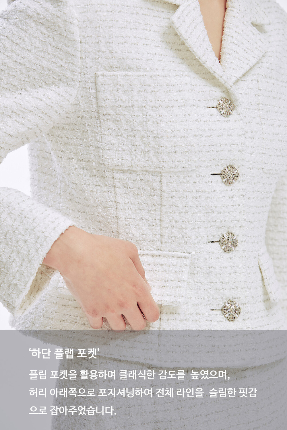 - 디자인 : 최근 컬렉션등에서도 많이 선보이는 짧은 기장감의 자켓입니다. 최고의 포지셔닝을 위해 자켓 카라에 대한 연구로 엣지가 살아있고 날렵한 라인으로 구성하였습니다. 허리가 살짝 들어간 라인이 핏을 잡아주고, 허리라인에 플랩 포켓을 포지셔닝하여 핏에 대한 안정감을 더하였습니다.