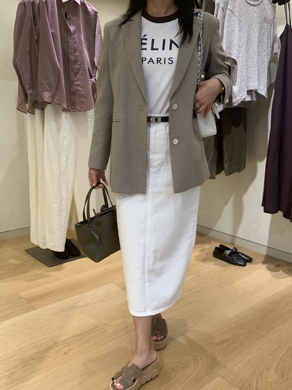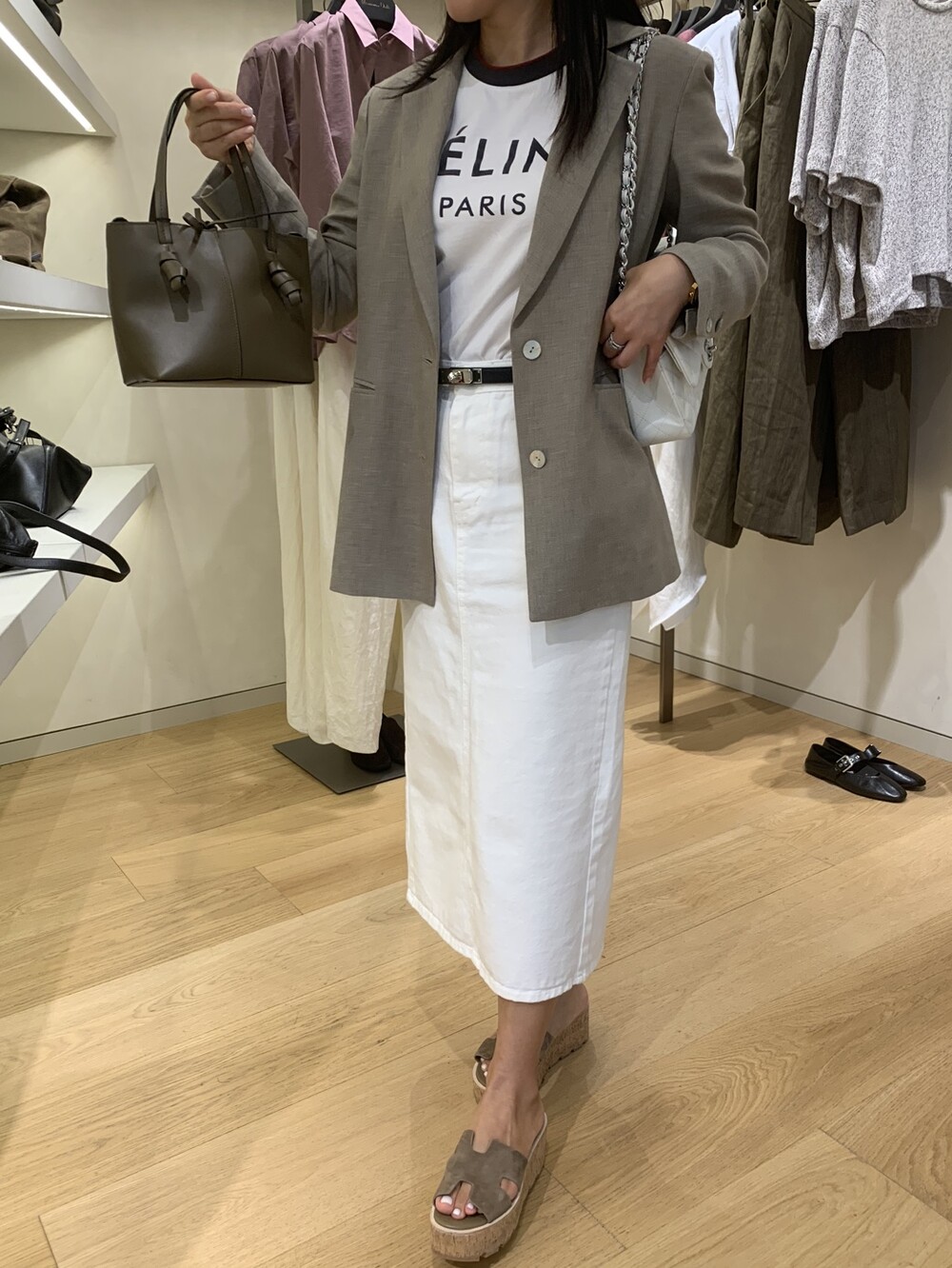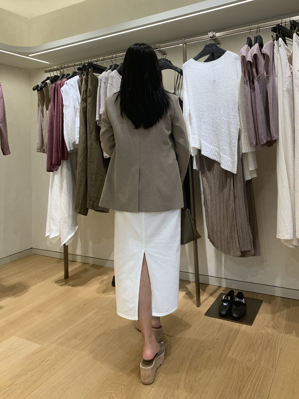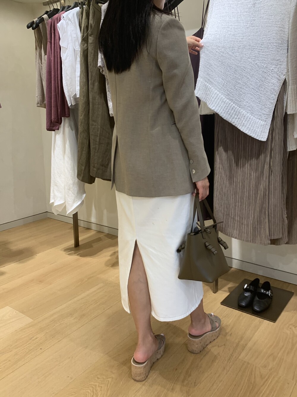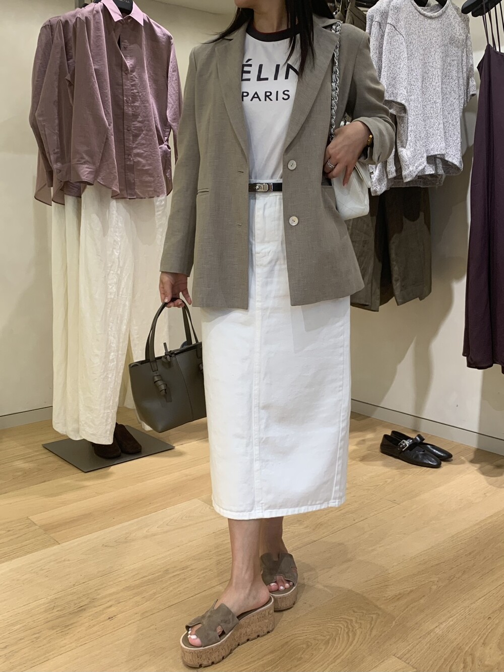 편안하게 떨어지는 바디 라인의 우아함과 자켓의 클래식한 엣지를 만들어 가는 카라의 포지션
