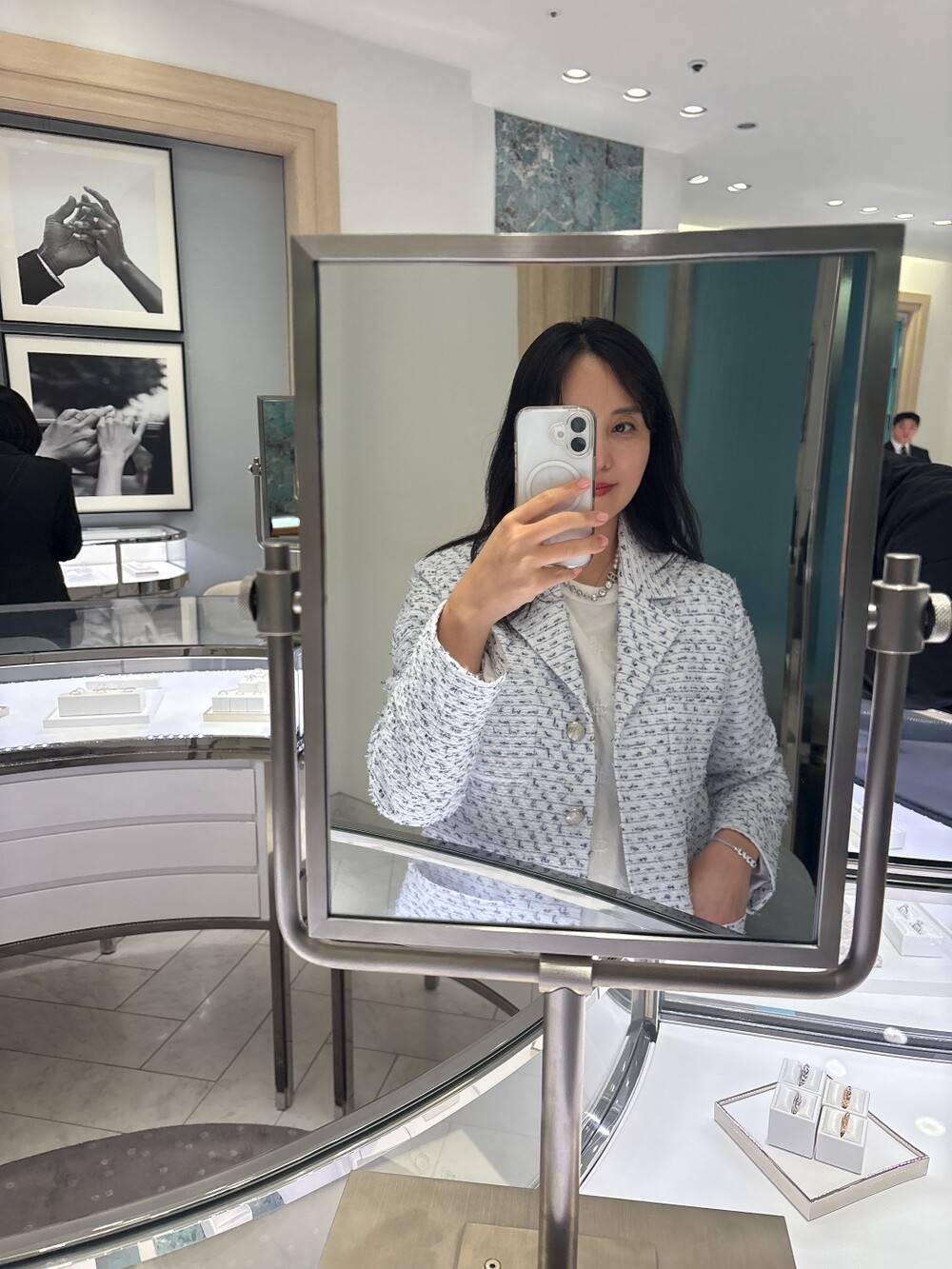 편안하게 떨어지는 바디 라인의 우아함과 자켓의 클래식한 엣지를 만들어 가는 카라의 포지션