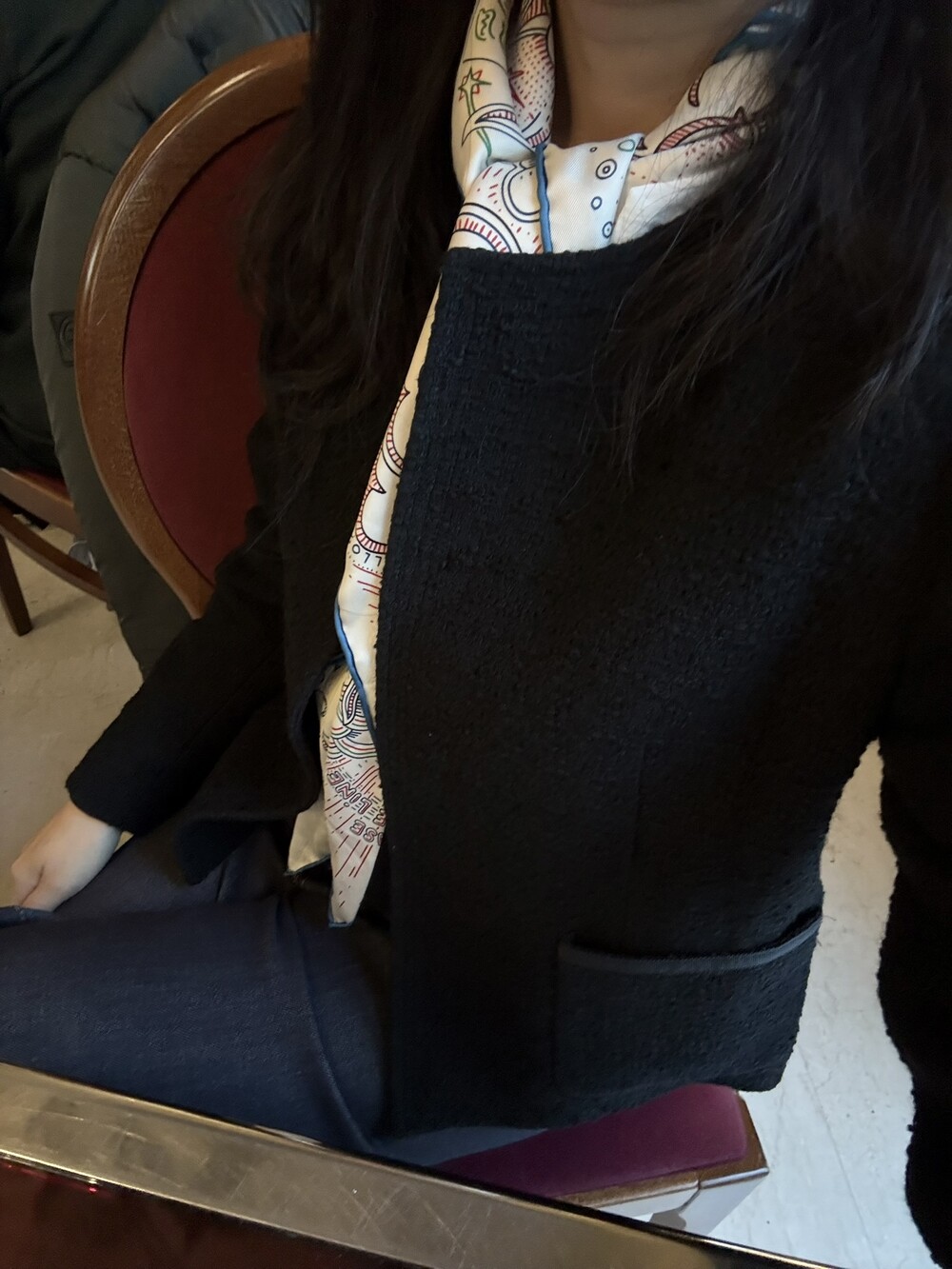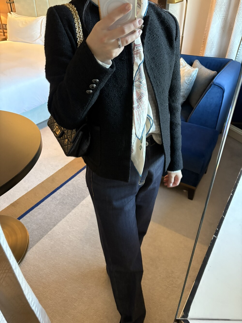 편안하게 떨어지는 바디 라인의 우아함과 자켓의 클래식한 엣지를 만들어 가는 카라의 포지션