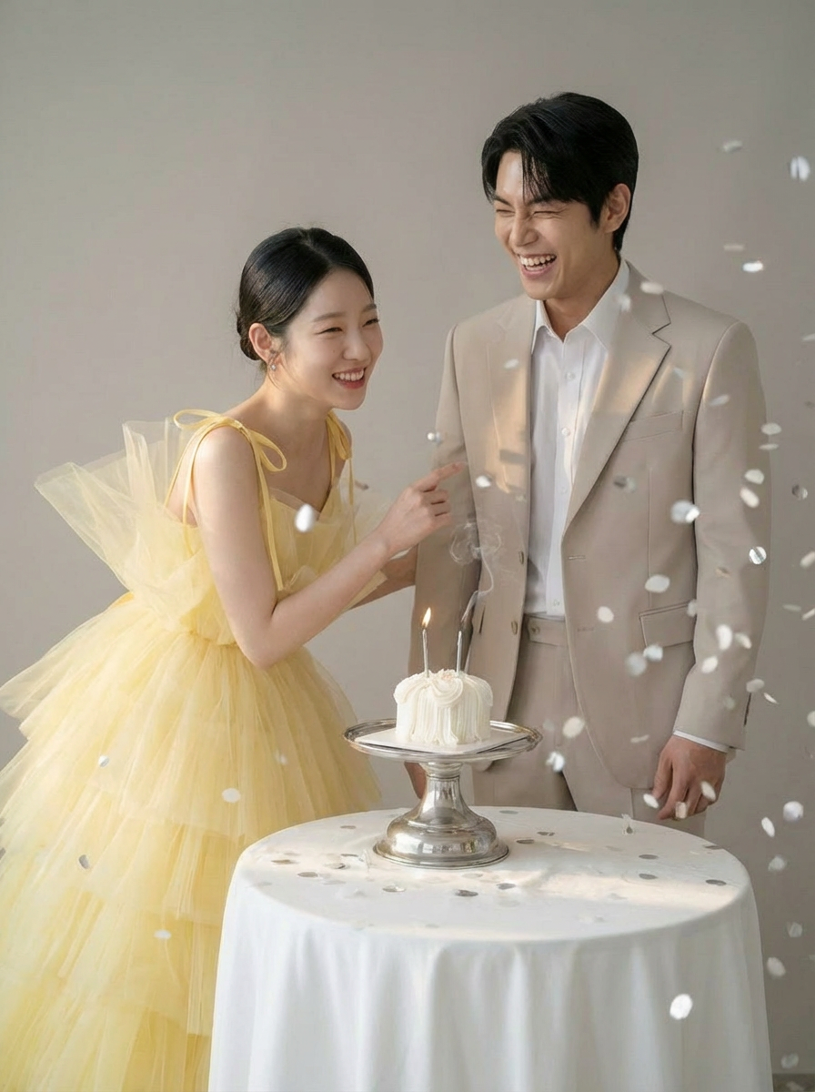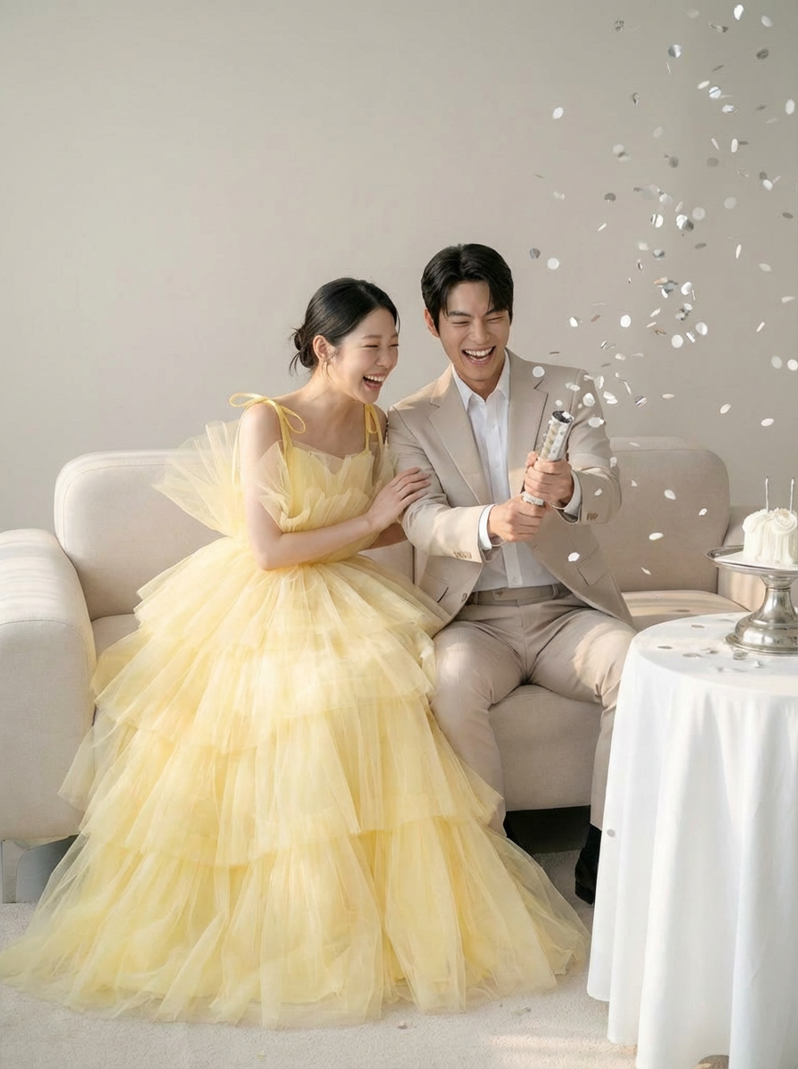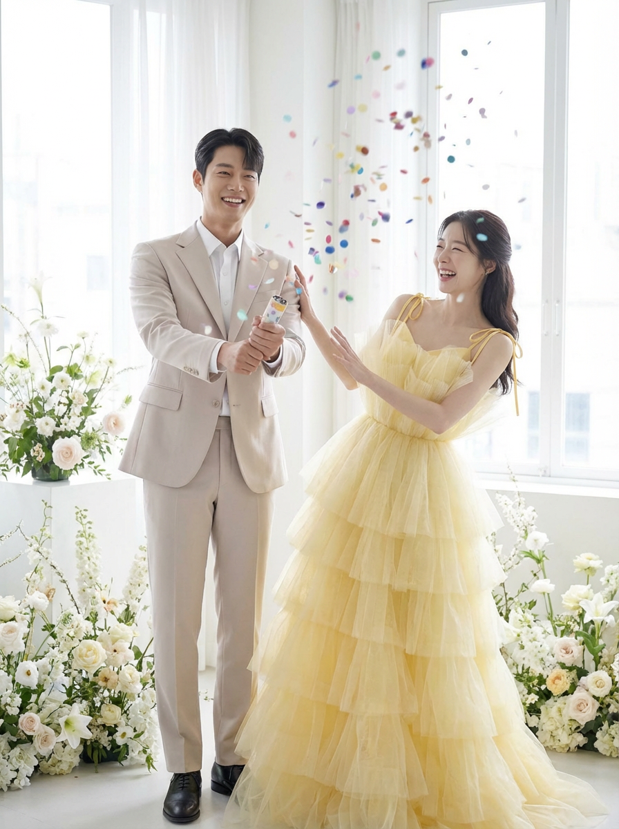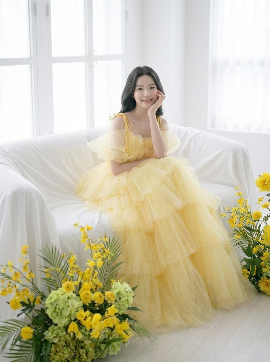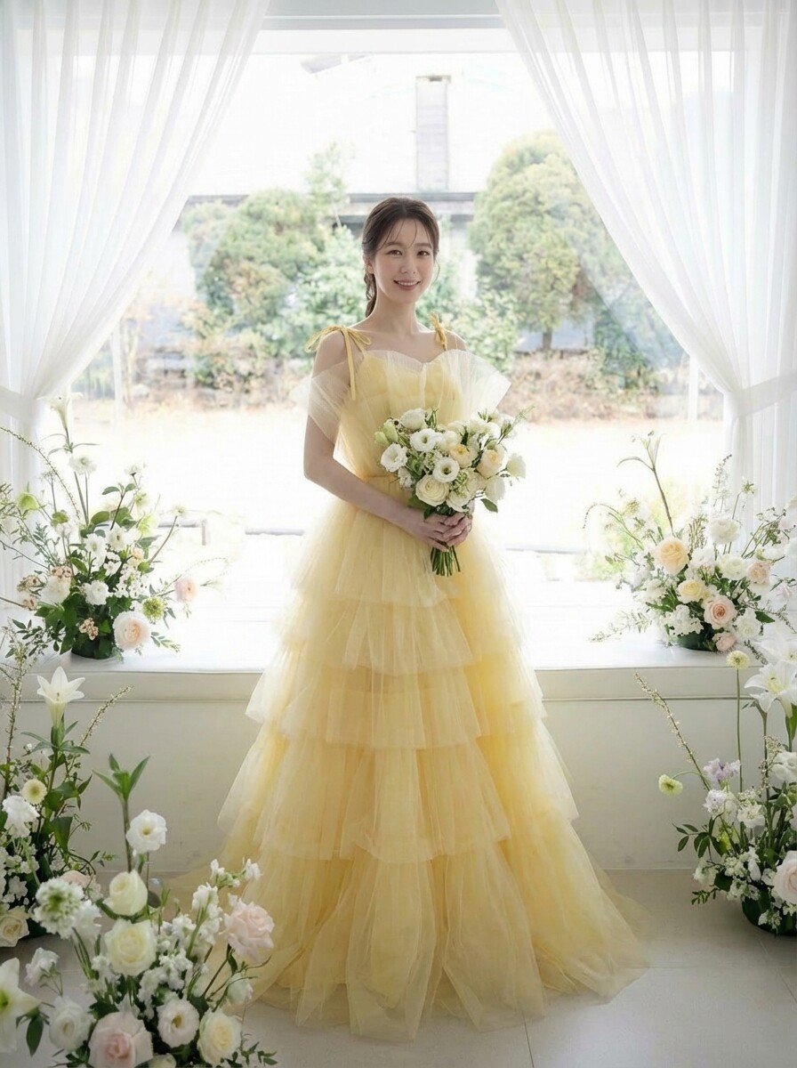 화이트보다 따뜻하고, 컬러 드레스보다 가볍게 스며드는연한 옐로 톤이 피부에 자연스럽게 녹아들며신부의 표정과 분위기를 한층 더 부드럽게 밝혀줍니다.