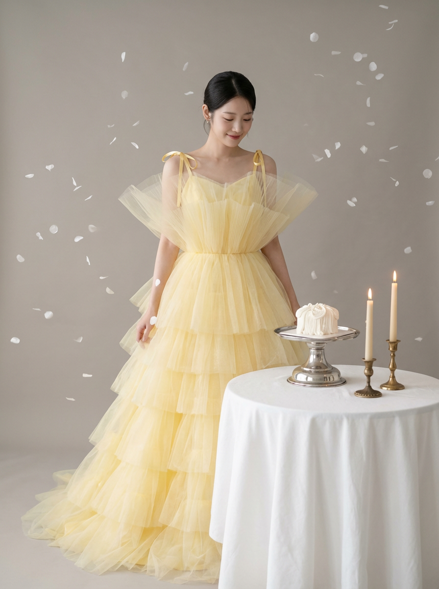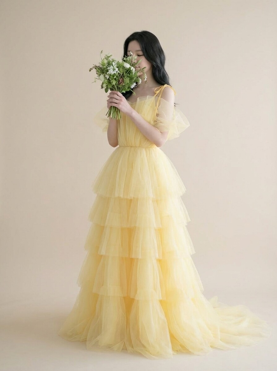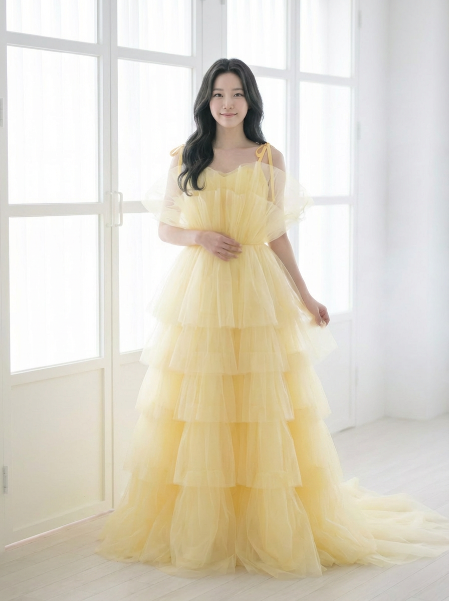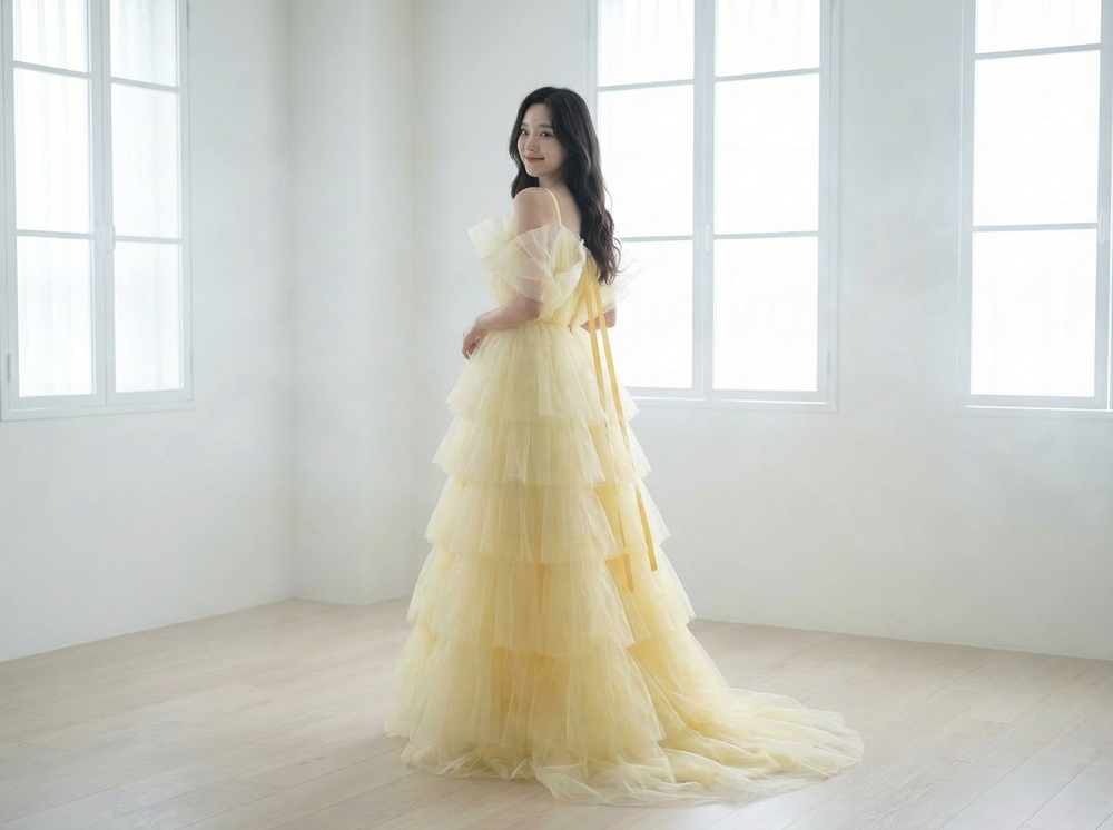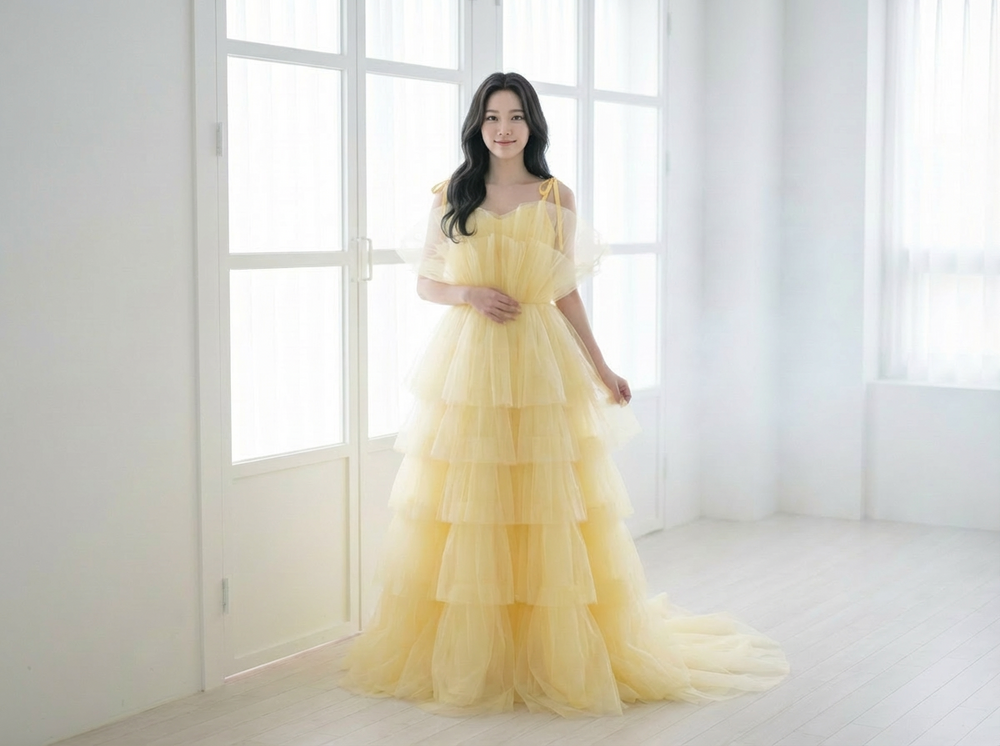 공기를 머금은 듯한 튤 텍스처가움직일 때마다 자연스럽게 흔들리며버터 옐로 컬러 특유의 따뜻하고 맑은 색감을 한층 더 살려줍니다.