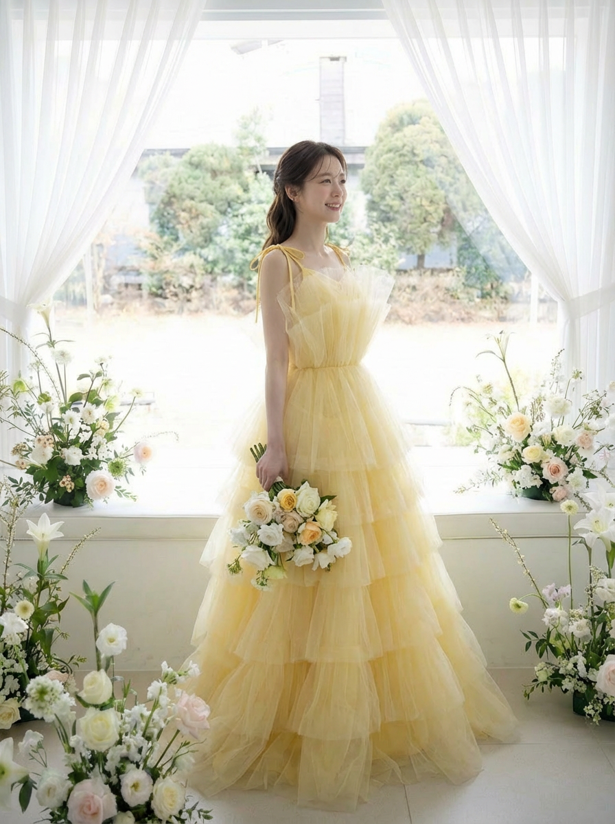 버터 옐로 가든 드레스는가든 웨딩, 스몰 웨딩, 프리 웨딩 촬영에 특히 잘 어울립니다.
